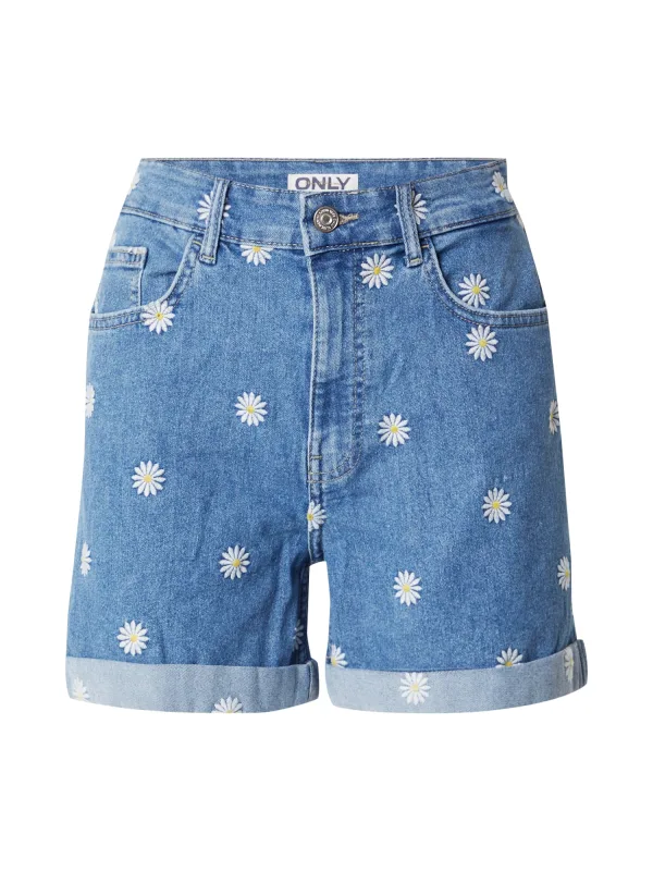 Design: Omgeslagen zoom, Ritssluiting, 5-pocket-style; Type sluiting: Ritssluiting; Materiaal: Denim; Motief: Bloemenprint; Details: Borduursels; Extra's: All-over patroon, Vaste grip, Riemlussen; Wassing: Blauw denim; Lengte: Kort/mini; Pasvorm: Regular; Taillehoogte: Mid waist