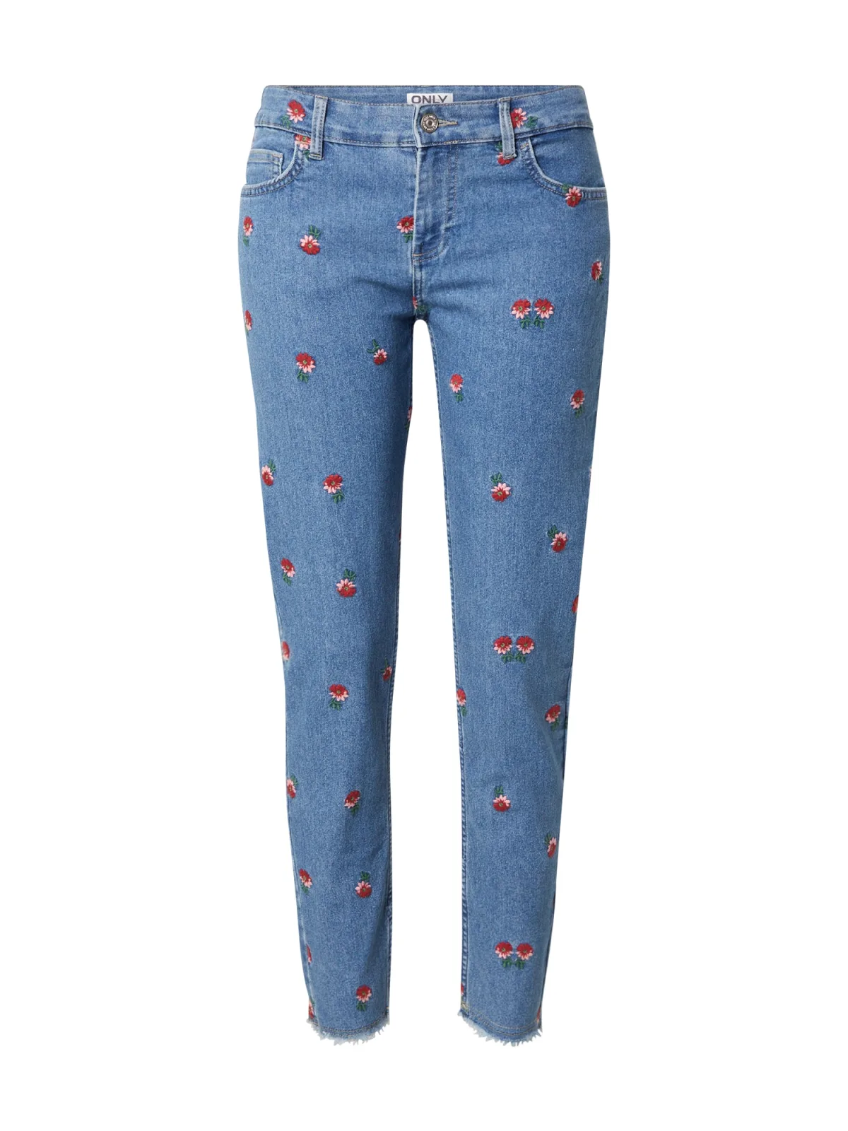 Design: Gefranjerde zoom, Ritssluiting, 5-pocket-style; Type sluiting: Ritssluiting; Materiaal: Denim; Motief: Bloemenprint; Details: Franjes, Borduursels; Extra's: All-over patroon, Riemlussen; Wassing: Blauw denim; Lengte: 7/8 lengte; Pasvorm: Skinny; Taillehoogte: Mid waist