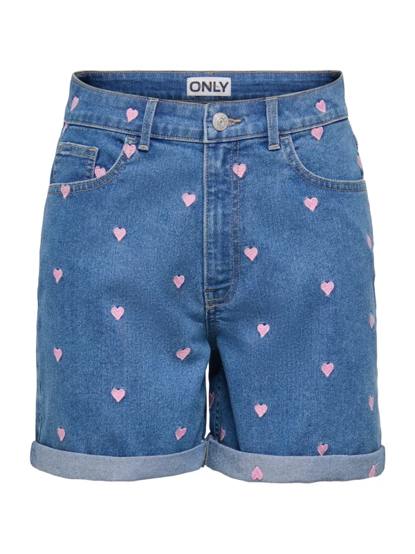 Design: Omgeslagen zoom, Ritssluiting, 5-pocket-style; Type sluiting: Ritssluiting; Materiaal: Denim; Details: Borduursels; Extra's: All-over patroon, Vaste grip, Riemlussen; Wassing: Blauw denim; Lengte: Kort/mini; Pasvorm: Regular; Taillehoogte: Mid waist
