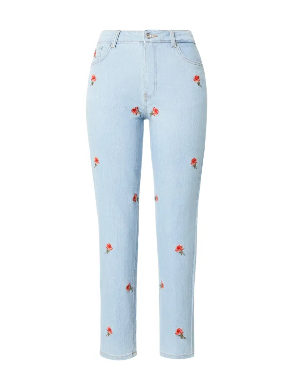 Design: Gevoerde zoom/rand, Ritssluiting, 5-pocket-style; Type sluiting: Ritssluiting; Materiaal: Denim; Motief: Bloemenprint; Details: Borduursels; Extra's: All-over patroon, Vaste grip, Riemlussen; Wassing: Light washed; Lengte: 7/8 lengte; Pasvorm: Regular; Taillehoogte: High waist