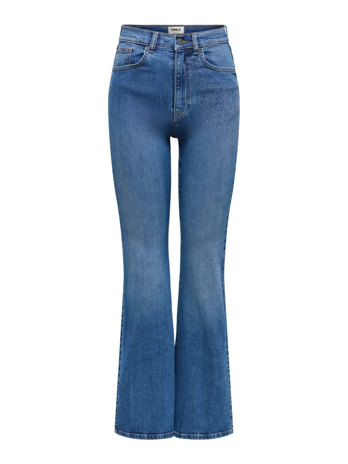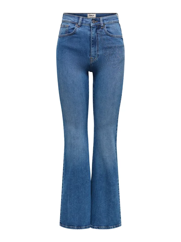 Design: Gevoerde zoom/rand, Ritssluiting, 5-pocket-style; Type sluiting: Ritssluiting; Materiaal: Denim; Motief: Effen; Details: Sierstenen; Extra's: Contrasterende naden, Vaste grip, Riemlussen; Wassing: Blauw denim; Lengte: Lang/maxi; Pasvorm: Flared; Taillehoogte: High waist