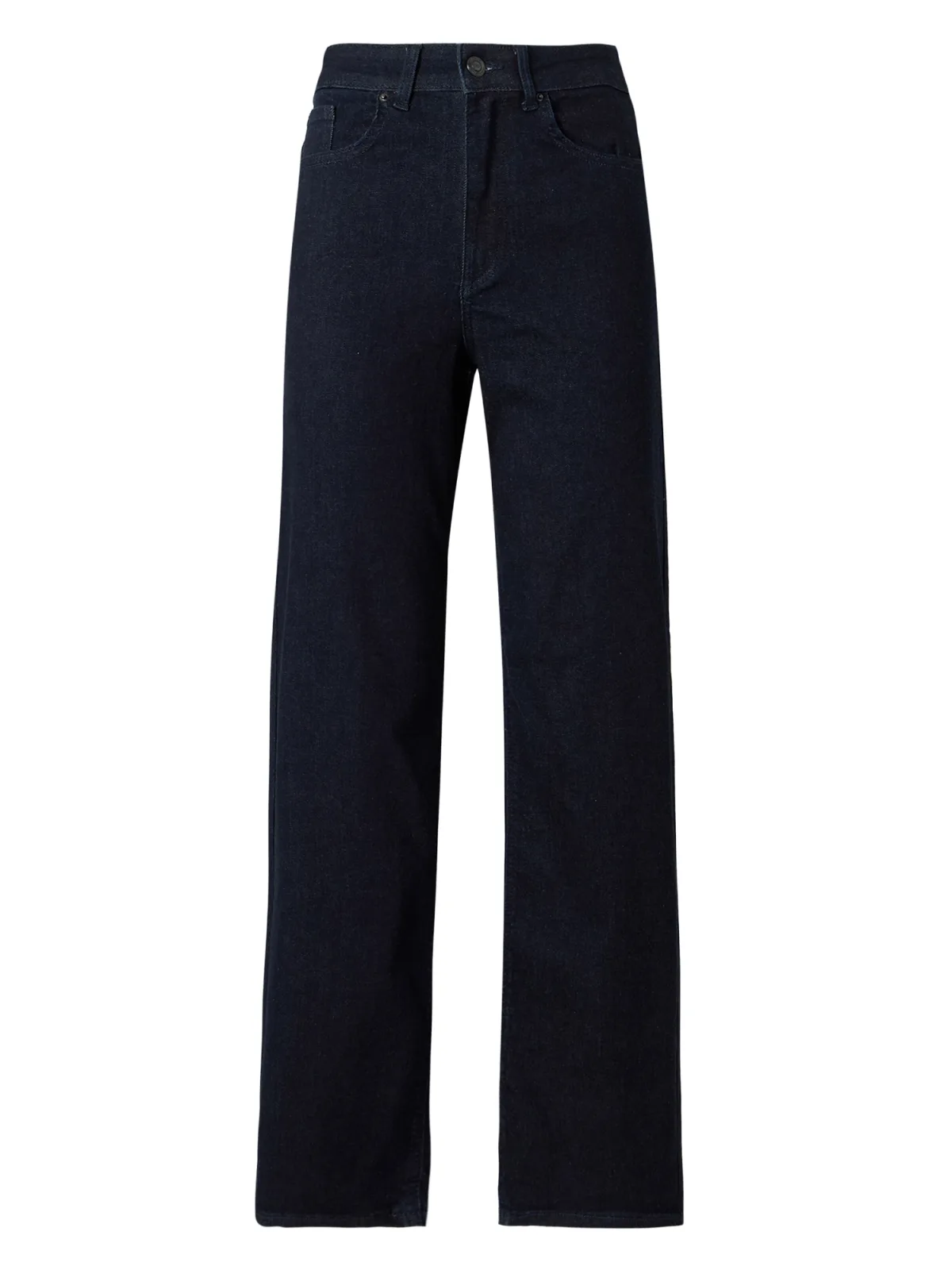 Design: Gevoerde zoom/rand, Ritssluiting, 5-pocket-style; Type sluiting: Ritssluiting; Materiaal: Denim; Motief: Effen; Extra's: Studs, Op staal naden, Vaste grip, Riemlussen; Wassing: Rinsed/dark washed; Lengte: Lang/maxi; Pasvorm: Wide leg; Taillehoogte: High waist
