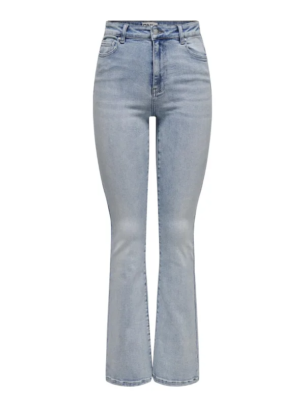 Deze flared jeans voor dames van ONLY heeft een hoge taille en is uitgevoerd in een lichte blauwe denimkleur. Met een rits- en knoopsluiting en klassieke 5-pocketstijl is dit model ideaal voor dagelijks gebruik.