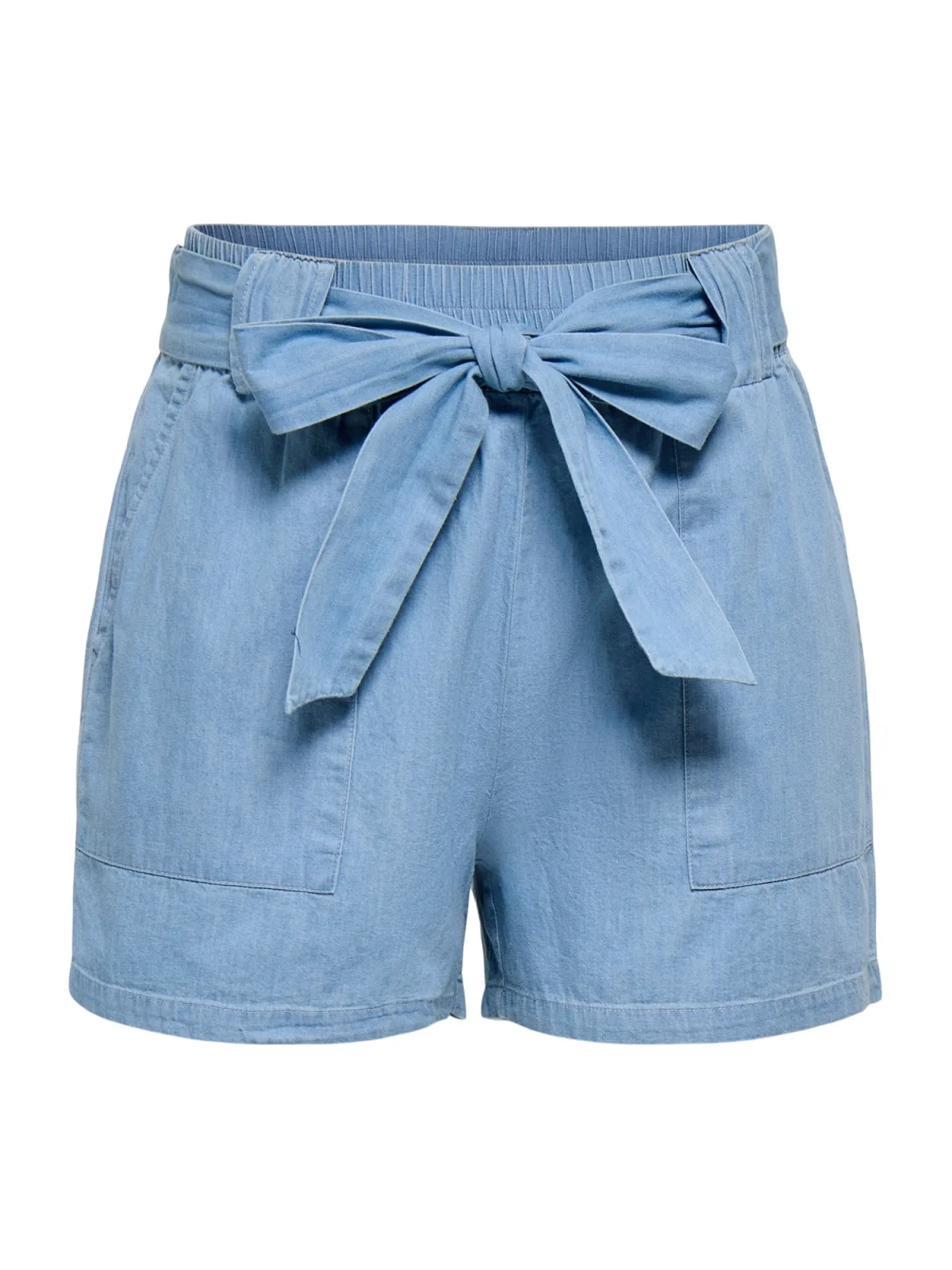 Design: Elastische taille/zoom, Opgezette zakken, Met riem; Materiaal: Denim; Motief: Effen; Details: Gedrapeerd; Extra's: Gewassen effect, Riemlussen; Wassing: Light washed; Lengte: Kort/mini; Pasvorm: Regular; Taillehoogte: High waist