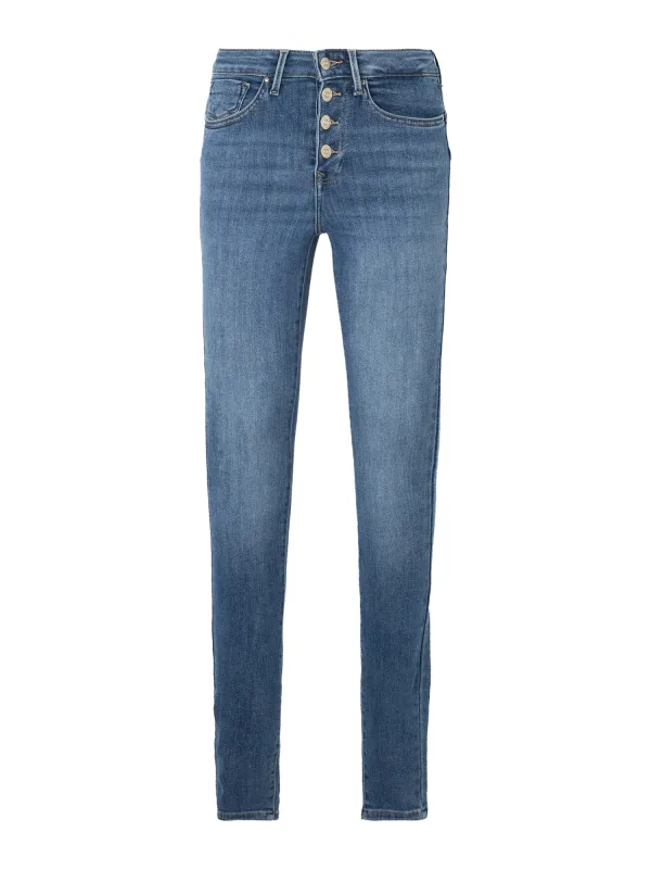 Design: Knoopsluiting, 5-pocket-style; Type sluiting: Knoopsluiting; Materiaal: Denim; Motief: Effen; Extra's: Gewassen effect, Riemlussen; Wassing: Blauw denim; Lengte: Lang/maxi; Pasvorm: Skinny; Taillehoogte: Mid waist