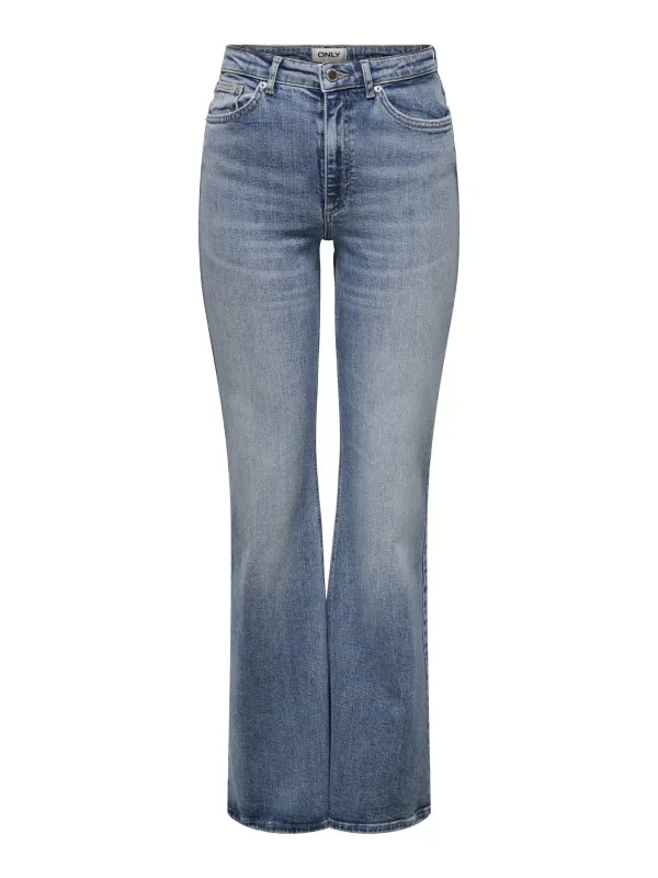 Design: Ritssluiting, 5-pocket-style; Type sluiting: Ritssluiting; Materiaal: Denim; Motief: Effen; Extra's: Label patch/label flag, Riemlussen; Wassing: Light washed; Lengte: Lang/maxi; Pasvorm: Flared; Taillehoogte: Mid waist