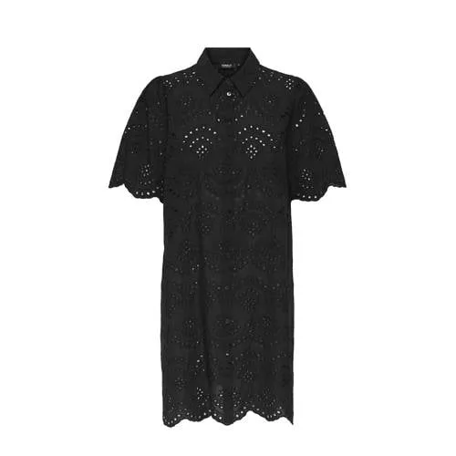 Deze jurk van ONLY ONLVALAIS is zwart en heeft korte mouwen. Gemaakt van katoen met een klassieke kraag en broderie. De knoopsluiting voegt een stijlvolle touch toe aan je look. Perfect voor zomerse dagen.