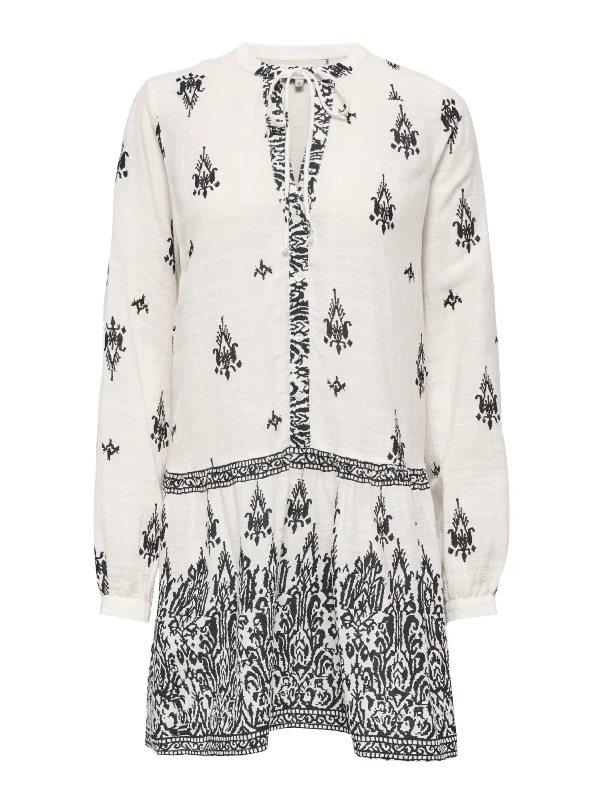 Dames vrijetijdsjurk van Only;Model 'Alma';look: all-over motief;Pasvorm: tuniek;Lengte: mini;hals: diepe V-hals;Patroon: abstract;Details: knopen;Mouwvorm: lange mouw;mouwboord: manchet;materiaalverwerking: gevlamd garen;Materiaal: mix van katoen en viscose