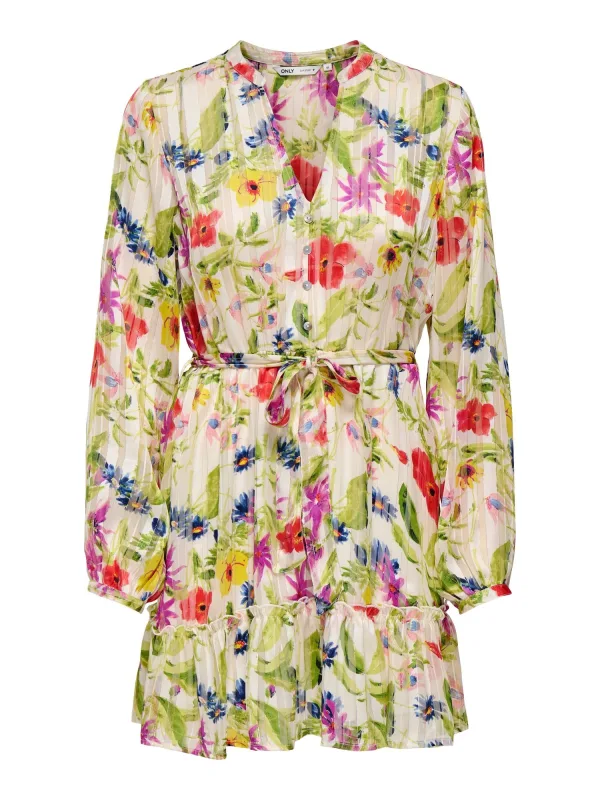 Vrijetijdsjurk van Only;Model 'Avery';Look: effen;Pasvorm: getailleerd;Lengte: Mini ;Hals: V-hals;Details: Effectgaren;Sluiting: Tailleriem om vast te knopen;Mouwvorm: Ballonmouwen;Mouwboord: smalle manchet;Zoom: Volant;Materiaalverwerking: Chiffon