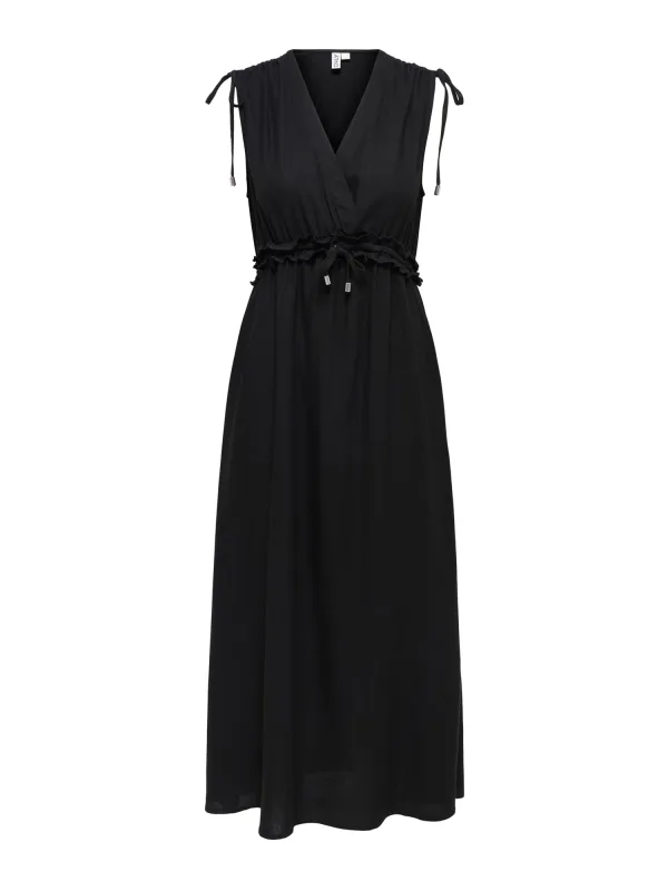 Design: Gevoerde zoom/rand, Elastische taille/zoom, Om te knopen/binden; Materiaal: Viscose; Halstype: Wikkeltop; Motief: Effen; Details: Ruches, Gedrapeerd, Wikkel design; Extra's: Verstelbare taille, Op staal naden; Lengte: Lang/maxi; Snit: Getailleerd; Pasvorm: Slanke pasvorm; Armlengte: Mouwloos
