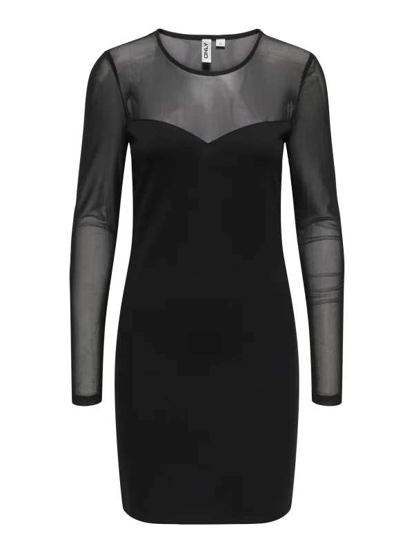 Design: Gevoerde zoom/rand, Rechte zoom; Materiaal: Viscose; Halstype: Ronde hals; Motief: Effen; Extra's: Mesh voering, Licht transparant, Op staal naden; Lengte: Kort/mini; Snit: Figuur omarmend; Pasvorm: Aansluitende pasvorm; Armlengte: Lange mouw