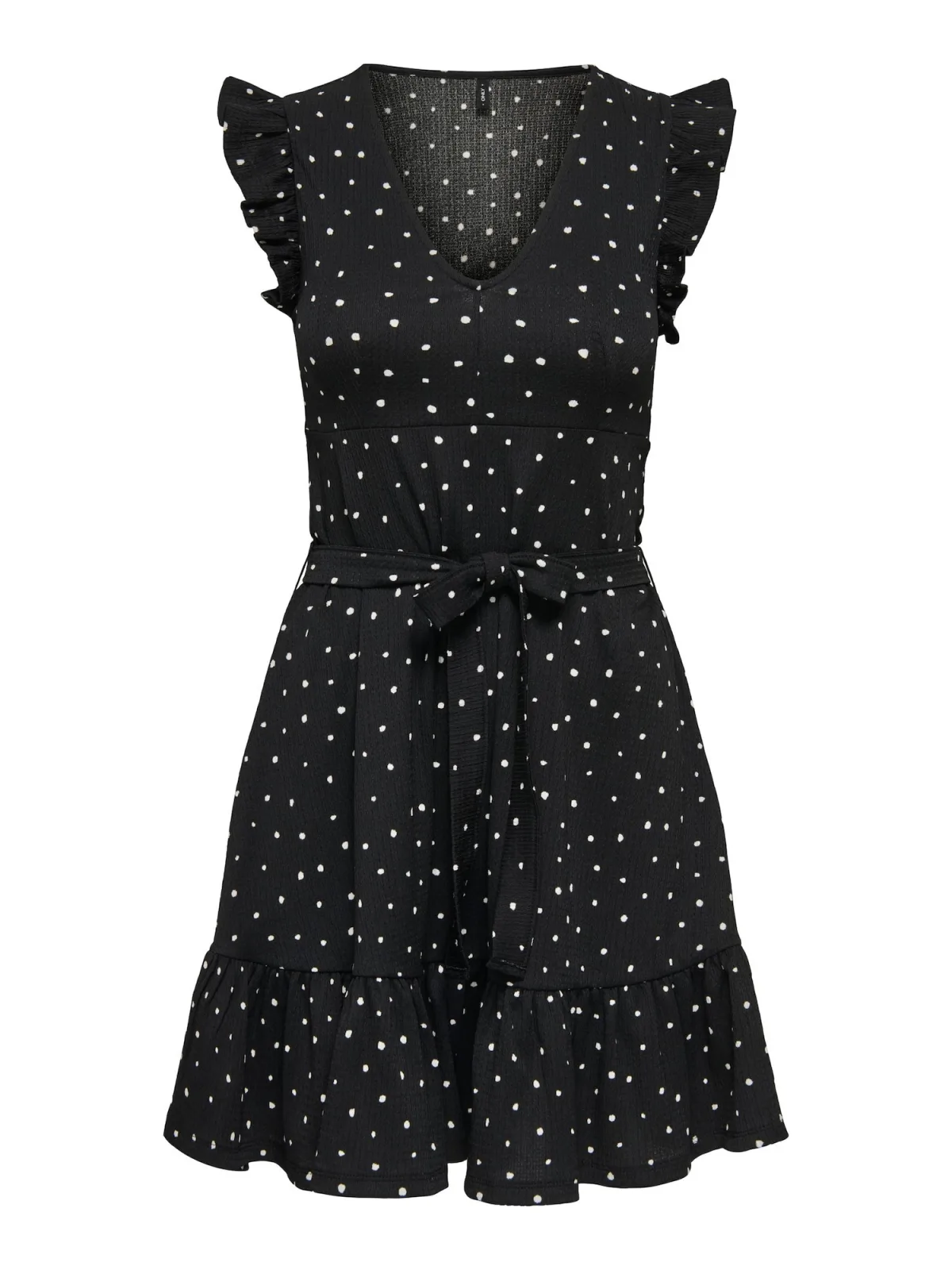 Design: Om te knopen/binden; Halstype: V-hals; Motief: Gestippeld; Details: Volant; Extra’s: All-over patroon; Lengte: Kort/mini; Pasvorm: Normale pasvorm; Armlengte: Kwartmouw