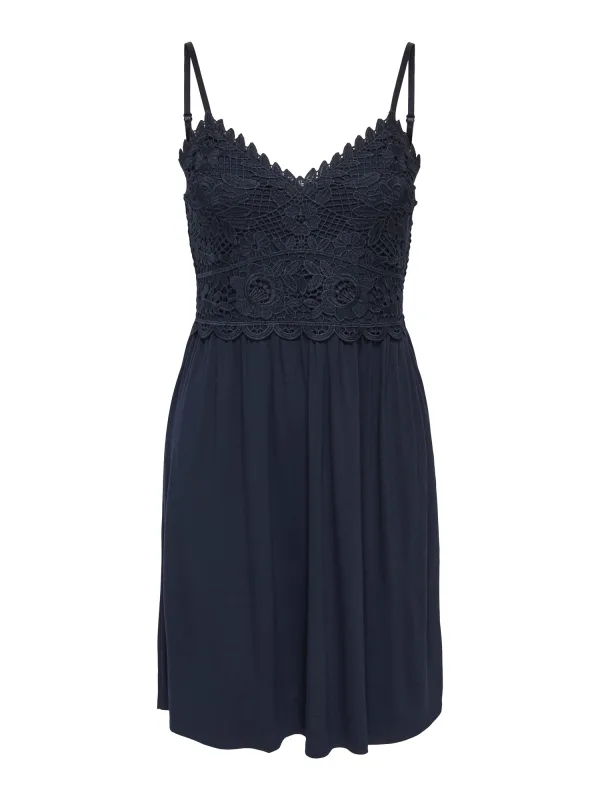 Design: Gevoerde zoom/rand, Diepe snit/decolleté; Materiaal: Jersey; Halstype: V-hals; Motief: Effen; Soort bandjes: Spaghettibandjes; Details: Kant, Gedrapeerd; Extra's: Verstelbare bandjes, Op staal naden, Voelt zacht aan; Lengte: Kort/mini; Snit: Getailleerd; Pasvorm: Normale pasvorm; Armlengte: Mouwloos