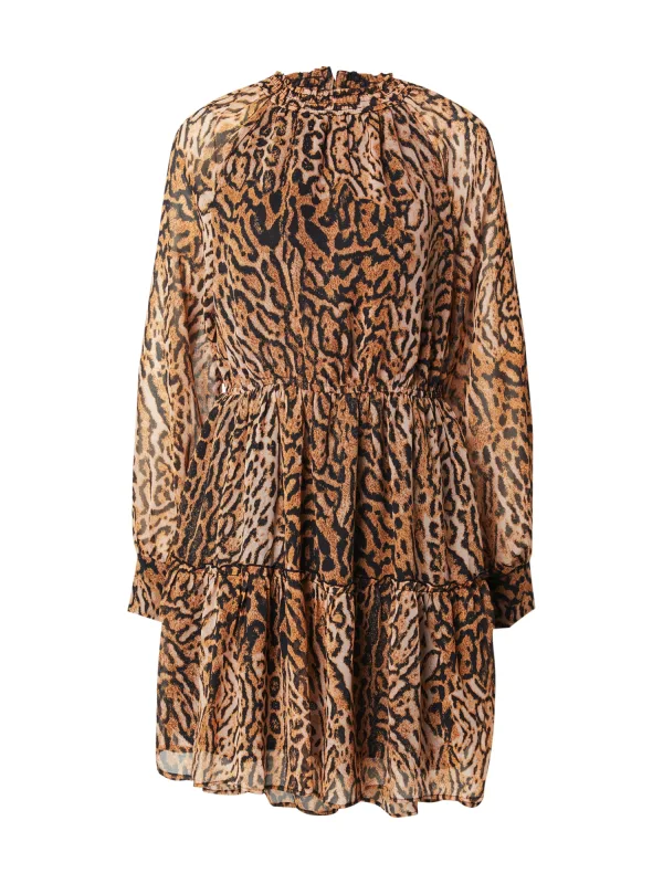Design: Gevoerde zoom/rand, Flare, Raglanmouwen; Type sluiting: Knoopsluiting; Materiaal: Chiffon; Halstype: Opstaande kraag; Motief: Dierenprint; Details: Cut-outs, Volant, Gedrapeerd; Extra's: Licht transparant, All-over patroon, Lichte stof; Lengte: Knielengte; Pasvorm: Wijde pasvorm; Armlengte: Lange mouw