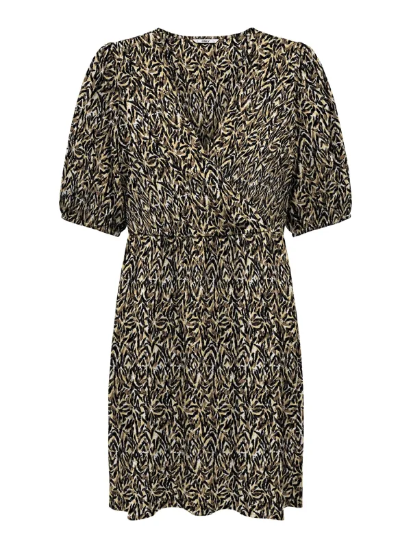 Design: Elastische taille/zoom, Pofmouwen, Diepe snit/decolleté; Materiaal: Gerecycled materiaal; Halstype: V-hals; Details: Gedrapeerd, Wikkel design; Extra's: All-over patroon, Gladde stof; Lengte: Kort/mini; Pasvorm: Normale pasvorm; Armlengte: Halve mouw