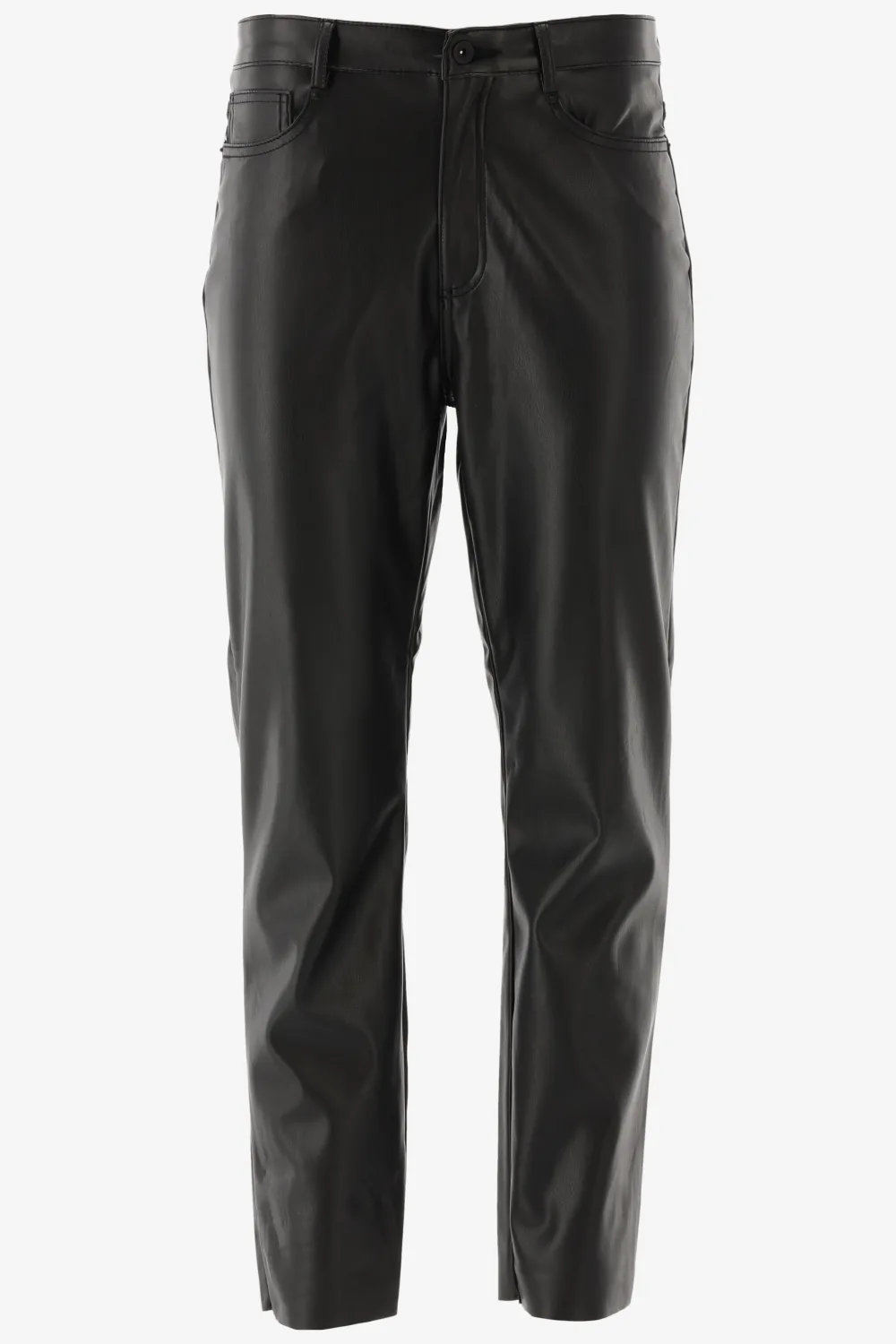 - Rechte lederlook broek- Lengte deuvel- Hoge taille- 5 zakken- Riem gespen- Voorsluiting- Rekbaar materiaal- Binnenbeenlengte: 75 cm in maat S/34- Het model draagt maat S/34