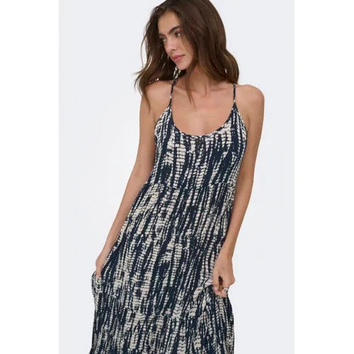 Voor zonnige dagen en lichte lagen is deze donkerblauwe maxi jurk met print van ONLY een fijne basis in je garderobe. De lange, soepelvallende jurk in donkerblauw met ecru all over print geeft een ontspannen en toch verzorgde look. De geweven stof van 100% viscose voelt licht aan op de huid en beweegt gemakkelijk met je mee, ideaal voor lente en warme dagen.Details die het verschil maken Lange maxi jurk met luchtige spaghettibandjes Ronde hals voor een zachte, vrouwelijke uitstraling Geweven stof van 100% viscose, soepel en comfortabel Donkerblauwe basis met ecru all over print voor een speels patroon Zonder sluiting, je trekt de jurk eenvoudig over het hoofd aan Zonder zakken voor een gladde, slanke belijning Vallen volgens maatadvies: dit artikel valt normaal Wasbaar op 30 graden, lauw strijkbaar (1 punt) en niet drogen in de droogtrommelRelaxte look voor elke dagDeze maxi jurk past goed bij je dagelijkse outfits in de lente. Draag de jurk met sandalen en een licht vest voor naar kantoor of school, of combineer met sneakers en een denim jack voor een casual dagje uit.ONLY, jouw alledaagse fashion basicONLY staat bekend om moderne, toegankelijke mode met een draagbare pasvorm. De collecties sluiten aan op de trends van nu en zijn ontworpen om makkelijk te combineren met wat je al in de kast hebt. Zo voeg je met deze jurk eenvoudig een veelzijdig item toe waar je vaak naar grijpt.Een lange, luchtige jurk die je zonder nadenken aantrekt op dagen dat je makkelijk én verzorgd gekleed wilt gaan.