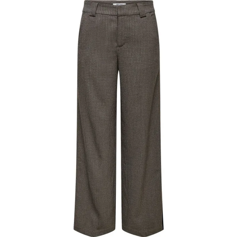 De Only pantalon in warm bruin toont een fijn geruit dessin dat klassiek en eigentijds tegelijk oogt. De hoge taille omkadert je taille op een elegante manier en geeft de broek een verfijnde, vrouwelijke snit; door de normale lengte en pasvorm kun je hem zowel met laarzen als met pumps dragen zonder je look te verliezen. Het zachte mengsel van viscose, elastane en gerecycled polyester voelt soepel en heeft net genoeg stretch om vrij te bewegen, terwijl de zwarte biezen langs de zijnaden een subtiel contrast en structuur toevoegen. Doordat het geweven ruitpatroon klein en ingetogen is, combineert de pantalon moeiteloos met zowel effen truien als speelse blouses. Je ervaart een nette, verzorgde uitstraling die tegelijk relaxed blijft, ideaal voor dagen waarop stijl en gemak hand in hand gaan. Werk de outfit af met een warme trui of een kort jackje en voel je zelfverzekerd en stijlvol.