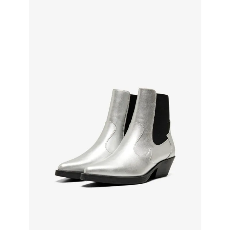 en#10;Op zoek naar een stoere en trendy toevoeging aan jouw schoenencollectie? Dan zijn deze zilverkleurige laarzen van het bekende merk Only echt iets voor jou! Deze laarzen zijn perfect voor dames die houden van een combinatie tussen cowboylaarzen en een trendy look.en#10;en#10;Dit kort cowboy laarsje genaamd Bronco is voorzien van een handige slip on sluiting met elastisch materiaal. Hierdoor zijn ze gemakkelijk aan en uit te trekken. De enkelhoogte geeft een subtiele maar toch stoere uitstraling. De duurzame buitenzool van TPR zorgt voor extra grip en comfort.en#10;en#10;De hakhoogte van 4,5 cm geeft jouw outfit net dat beetje extra pit. De laarzen zijn gemaakt van 90% polyurethaan en 10% polyester, waardoor ze erg stevig zijn en lang meegaan. De kleur zilver geeft een speelse touch aan elke outfit en laat jouw schoenen stralen.en#10;en#10;Met deze Only laarzen aan jouw voeten ben je klaar voor elke gelegenheid. Draag ze onder een stoere jeans voor een casual look of combineer ze met een jurkje voor een trendy uitstraling. Welke stijl je ook kiest, met deze zilverkleurige laarzen ben jij altijd on-trend! Bestel ze nu voor een stoere toevoeging aan jouw kledingcollectie.