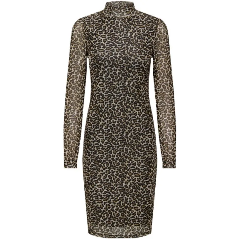 De Only Erica jurk is het perfecte kledingstuk voor vrouwen die houden van een trendy en opvallende look. Deze prachtige jurk is voorzien van lange, doorzichtige mouwen en heeft een hoge hals die zorgt voor een elegante touch. Maar dat is nog niet alles, want de jurk is gemaakt van een zachte stof met een all-over panterprint dessin in een prachtig bruine kleur. Hierdoor ben je met deze jurk verzekerd van een echte eyecatcher!en#10;en#10;De Only jurk heeft een regular fit, wat zorgt voor een comfortabele en flatterende pasvorm. Daarnaast is de jurk voorzien van een onderjurk, waardoor je geen last hebt van doorschijnende stukken. De jurk is gemaakt van hoogwaardig materiaal, bestaande uit 95% polyester en 5% elastaan. Hierdoor kan je de jurk de hele dag door dragen zonder dat deze gaat knellen of vervormen.en#10;en#10;Met de Only Erica jurk ben je dus niet alleen on-trend, maar ook nog eens verzekerd van een hoogwaardig kledingstuk dat heerlijk zit. Combineer de jurk met een paar mooie hakken voor een feestelijke gelegenheid of met laarzen voor een meer casual look. Bestel deze bruin dessin kleurige jurk kort dames van het merk Only nu in onze webshop en creëer je eigen stijl!