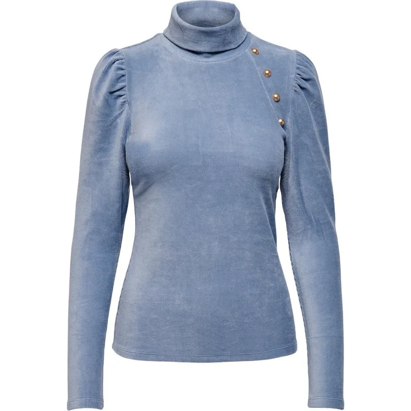 Deze blauw melee top van Only is een must-have item voor elke stijlvolle dame. De top is voorzien van een warme col en is gemaakt van ribgebreid materiaal. De gouden studs op de schouder geven een luxe touch aan deze mooie top.en#10;en#10;Wat deze top extra bijzonder maakt, zijn de lichte pofmouwen door de plooien bij de schouders. Dit geeft een speels effect aan de verder strakke top. De top is gemaakt van hoogwaardige materialen, namelijk 60% BCI katoen, 39% polyester en 2% elastaan. Dit betekent dat de top niet alleen comfortabel zit, maar ook duurzaam is.en#10;en#10;De blauw melee kleur van de top is tijdloos en makkelijk te combineren met andere items uit je garderobe. Draag de top bijvoorbeeld op een jeans voor een casual look, of combineer het met een pantalon voor een meer geklede uitstraling. Hoe dan ook, met deze top van het merk Only zie jij er altijd on-trend uit.en#10;en#10;Bestel deze top nu bij nummerzestien en voeg een vleugje stijl toe aan je kledingcollectie. Wacht niet langer en laat deze prachtige top jouw nieuwe favoriete item worden!