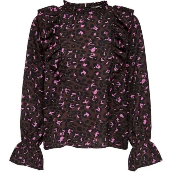 Update je garderobe met deze stijlvolle dames top van het bekende merk ONLY. De top is uitgevoerd in een prachtige bruin dessin kleur en heeft een tijdloze uitstraling. De lange mouwen zorgen voor een comfortabele fit en zijn perfect voor de koudere dagen. De ruffle details bij de schouders geven de top een speelse twist, terwijl de keyhole aan de achterkant zorgt voor een subtiel vleugje elegantie.en#10;en#10;Gemaakt van hoogwaardige materialen zoals 51% gerecycled polyester en 49% polyester, is deze top niet alleen trendy maar ook milieuvriendelijk. Draag hem op een mooie broek of rok voor een zakelijke look, of combineer hem met je favoriete jeans voor een casual uitstraling. Waar je hem ook mee combineert, met deze ONLY top ben je altijd on-trend. Bestel hem nu en voeg een must-have item toe aan je kledingkast!