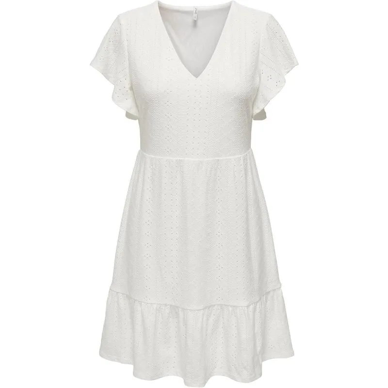 Deze schitterende korte jurk van het merk Only in de kleur off-white is een absolute must-have voor jouw zomergarderobe! De Sandra jurk is voorzien van een diepe V-hals en korte mouwen met speelse ruches voor een vrouwelijke touch. Het elastiek in de taille zorgt voor een mooie pasvorm en accentueert je taille op een subtiele manier. De jurk is ook nog eens erg comfortabel om te dragen dankzij het materiaal van 95% polyester en 5% elastaan.en#10;en#10;Wat deze jurk echt speciaal maakt, zijn de opengewerkte details die zorgen voor een speelse en luchtige look. Alleen bij de mouwen is de jurk gevoerd, wat zorgt voor een mooi contrast tussen de bedekte en onbedekte delen van de huid. De stof voelt heerlijk zacht aan en valt soepel om je lichaam.en#10;en#10;Met deze Only Sandra jurk ben je helemaal klaar voor elke zomerse gelegenheid. Draag hem met een paar sandalen en een strohoed naar het strand, of combineer hem met sleehakken en een denim jack voor een meer casual look. Bestel hem nu in onze webshop en voeg deze trendy off-white jurk toe aan jouw kledingcollectie!