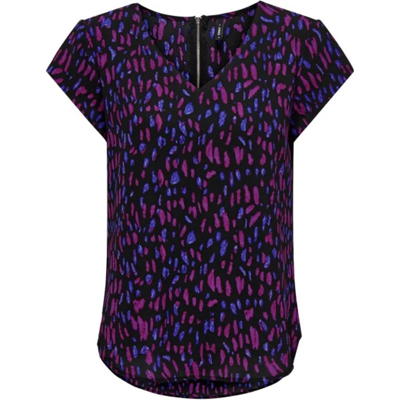 Deze trendy top van het merk Only is een echte aanwinst voor jouw kledingkast! De top heeft een opvallend paars dessin in combinatie met zwart en roze, wat zorgt voor een speelse en stijlvolle uitstraling. De V-hals en de kapmouwtjes geven de top een vrouwelijke touch. Daarnaast is de top voorzien van afgeronde zomen en een handige ritssluiting aan de achterkant.en#10;en#10;De top is gemaakt van 100% polyester, wat zorgt voor een comfortabele en soepele pasvorm. Door de hoogwaardige kwaliteit van Only kan je vertrouwen op een duurzaam en mooi item. Draag deze top op een jeans voor een casual look, of combineer het met een rok voor een chique outfit. Hoe je het ook styled, met deze top ben jij altijd on-trend! Bestel nu deze paars dessin kleurige top km dames van Only bij NummerZestien en krijg het binnen no-time thuisbezorgd.