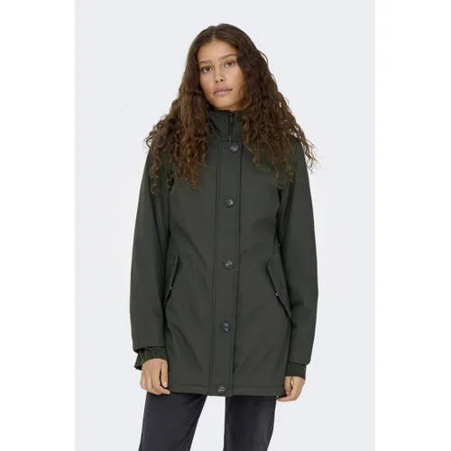 Deze jas van ONLY heeft een lange mouw en een capuchon. De jas sluit met een rits en knopen, is winddicht en gemaakt voor herfst en winter. Er zijn zijzakken.