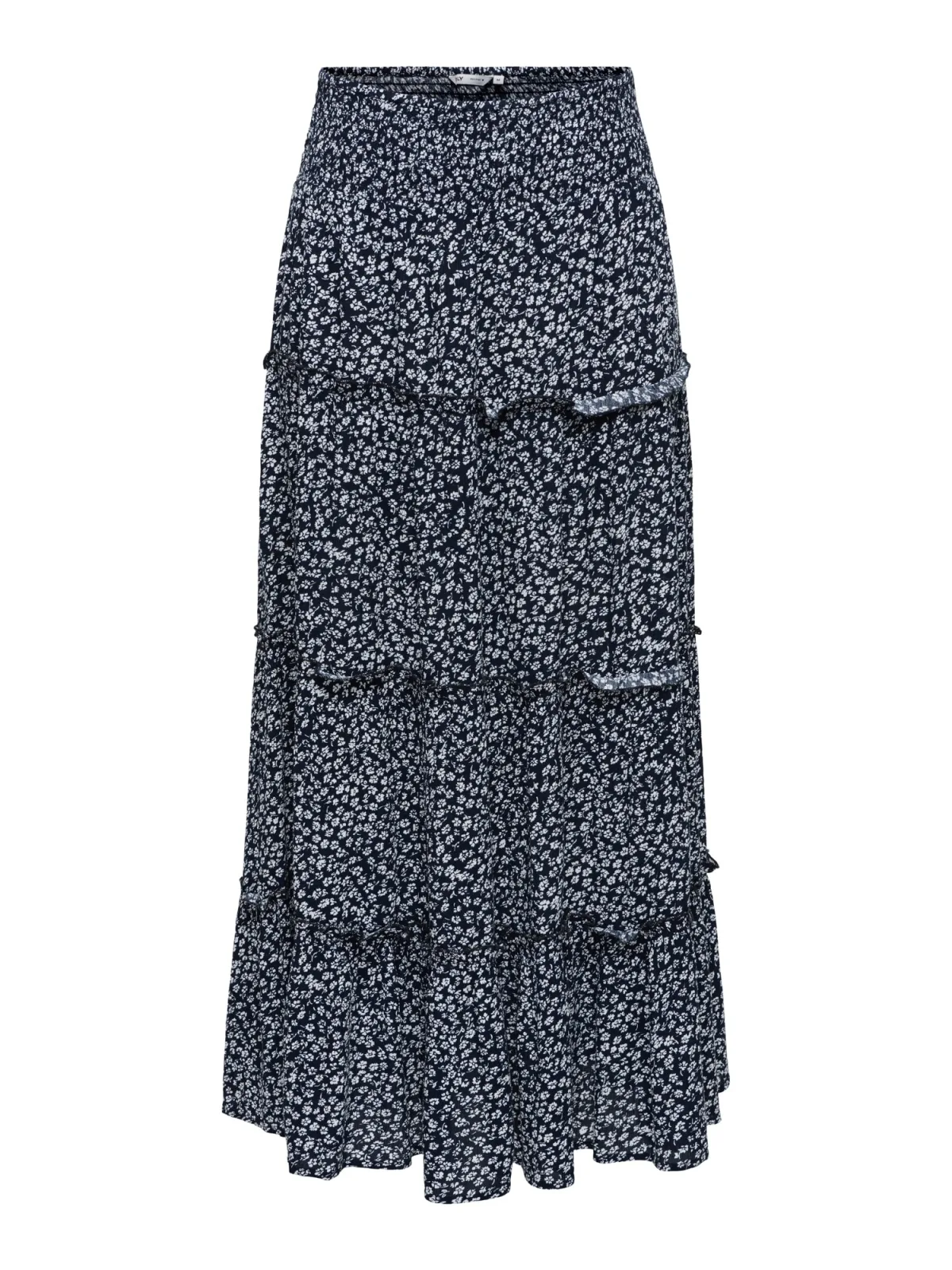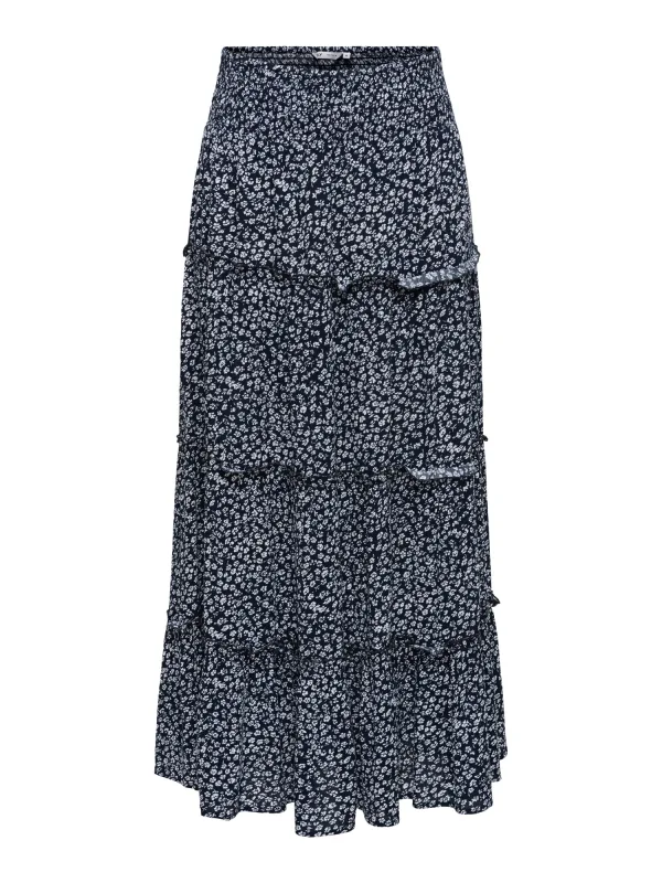 Dames maxirok van Only;Model ‘Fernanda’;look: all-over motief;pasvorm/model:: uitlopend;lengte: maxi;Applicatie: ruches;Details: Deelnaden;Boord: gesmokt;materiaalverwerking: crêpe;Materiaal: zuiver viscose