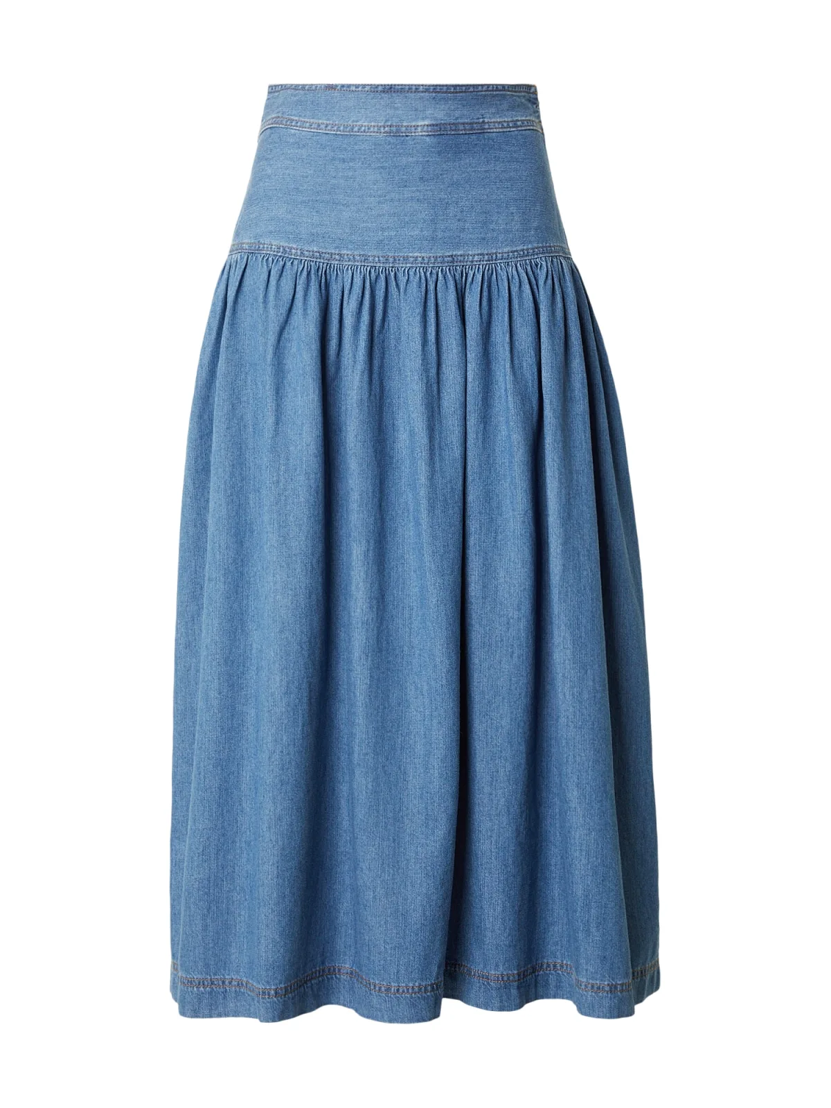 Design: Wijde taille, Ritszakken aan de zijkant; Type sluiting: Knoopsluiting; Materiaal: Denim; Motief: Effen; Rokvorm: A-lijn rok; Details: Gedrapeerd; Extra's: Contrasterende naden, Gewassen effect; Lengte: 7/8 lengte; Pasvorm: Normale pasvorm; Taillehoogte: High waist