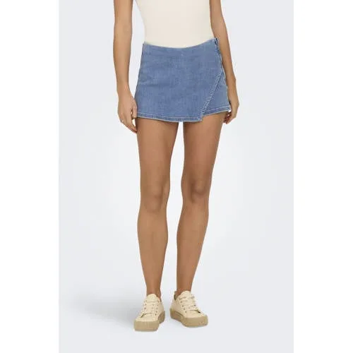 Deze ONLMIST-YASMINE rok van ONLY is gemaakt van denim. De kortere skorts hebben een overslagdetail en een korte rits. Perfect voor een casual look in een medium blauwe kleur.