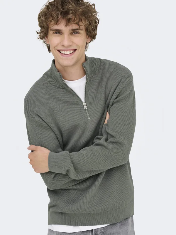 Deze rib gebreide trui van ONLY & SONS heeft een opstaande kraag en lange mouwen. De trui sluit met een halve rits. Het artikel is gemaakt van een katoenmix en heeft een regular fit.details van deze trui:• stijlnaam: ONSPHIL