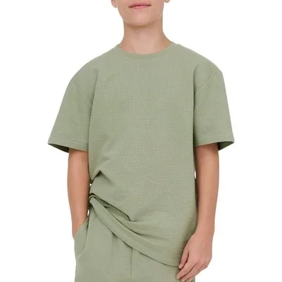 Voor elke schooldag en vrije middag is dit groene jongens T-shirt met korte mouw een praktische basis in de kast. Het effen shirt uit de ONLY & SONS JUNIOR collectie heeft een rustige uitstraling en laat zich makkelijk combineren met jeans, joggers of een korte broek. De subtiele textuur in de stof geeft net wat extra karakter, zonder drukke prints.Fijne pasvorm en dagelijks comfort Gemaakt van 97% katoen en 3% elastaan, voor een zachte stof met lichte stretch Korte mouwen en ronde hals, geschikt voor dagelijks gebruik in elk seizoen Effen groen, makkelijk te combineren met andere kledingstukken en schoenen Onderdeel van een co-ord set, voor wie graag een bijpassende outfit kiest Valt normaal volgens het maatadvies, kiezen van de gebruikelijke maat is voldoende Wasbaar op 40 graden en warm strijkbaar (2 punten) voor eenvoudig onderhoud Niet drogen in de droogtrommel, zo blijft de stof langer mooiIdeaal voor school en vrije tijdDit T-shirt past goed bij de dagelijkse garderobe van schoolkinderen en tieners. Draag het los in de zomer of onder een vest of hoodie op koelere dagen, zodat het het hele jaar door van pas komt.ONLY & SONS JUNIOR voor elke dagONLY & SONS JUNIOR richt zich op comfortabele kleding voor jongens, met een moderne en toegankelijke stijl. De items sluiten aan bij het dagelijkse leven, zodat combineren eenvoudig blijft en kinderen zich vrij kunnen bewegen.Een praktisch T-shirt dat makkelijk meedraait in de dagelijkse was en outfitroutine.