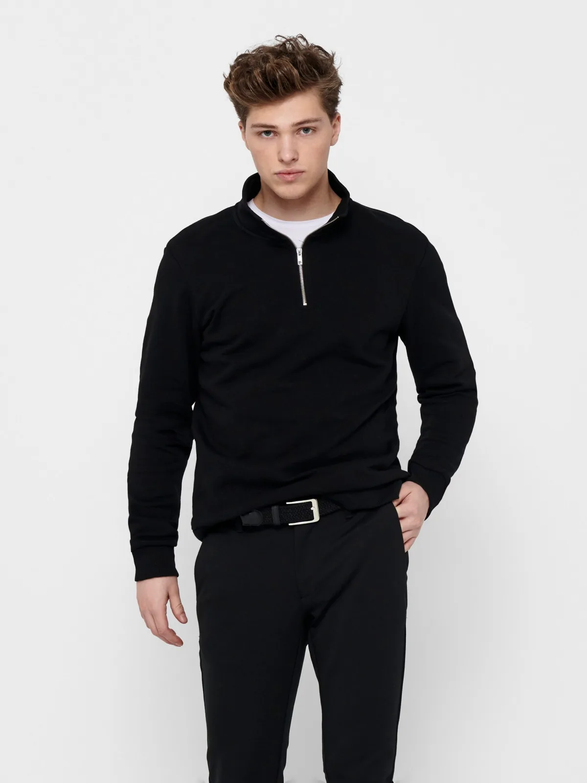 Specificaties: * Pasvorm: normale pasvorm * Rits: korte ritssluiting in de hals * Manchetten: elastische ribmanchetten * Kleur: zwart * Materiaal: 65% katoen - 35% polyester
