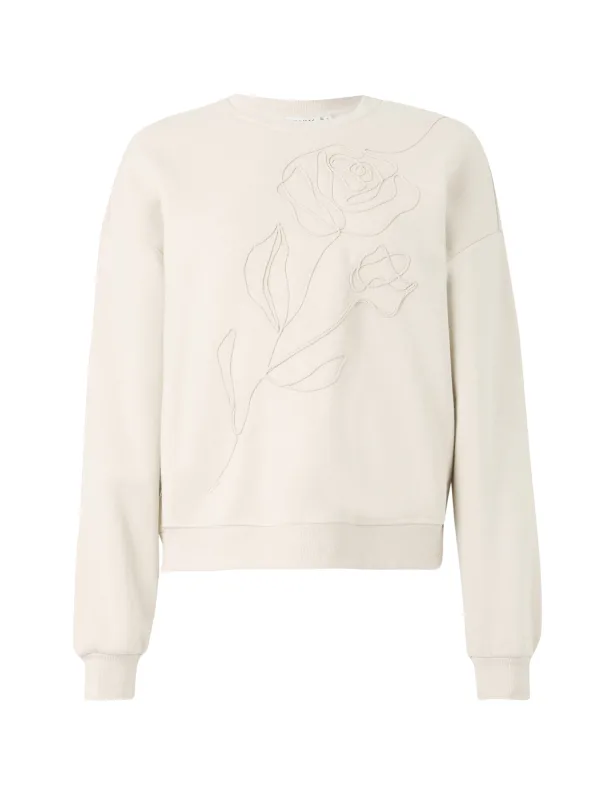 Design: Geribd ceintuurtje, Overcut schouder; Materiaal: Sweatstof; Halstype: Ronde hals; Motief: Bloemenprint; Details: Borduursels; Extra's: Voelt zacht aan, Huidvriendelijk materiaal; Pasvorm: Losse pasvorm; Armlengte: Lange mouw; Lengte: Normale lengte