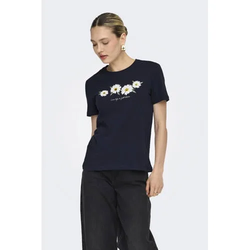 Vul je dagelijkse garderobe moeiteloos aan met dit donkerblauwe ONLY T-shirt dames. Het T-shirt heeft een ronde hals, korte mouwen en een rechte pasvorm die luchtig valt. De speelse print op de voorkant geeft een frisse, casual uitstraling die past bij verschillende looks, van jeans tot een rok.Details die het elke dag makkelijk maken Gemaakt van 100% katoen, voelt zacht aan op de huid en is geschikt om de hele dag te dragen Donkerblauwe kleur die gemakkelijk te combineren is met lichte en donkere onderstukken Korte, rechte mouwen voor een ontspannen silhouet Ronde hals die netjes aansluit zonder strak te zitten Met printopdruk op de voorkant voor een frisse, moderne look Valt normaal volgens het maatadvies, kies je gebruikelijke maat Wasbaar op 30 graden en lauw strijkbaar, zo houd je het T-shirt eenvoudig netjes Niet drogen in de droogtrommel, hierdoor blijft de vorm beter behoudenVoor alledaagse outfits in het voorjaarDit T-shirt komt uit de daily collectie en is geschikt voor het voorjaar en milde zomerdagen. Draag het losjes op een straight jeans en sneakers voor een ontspannen dag, of combineer het met een rok en sandalen voor een wat meer geklede look. Door de effen kleur en de subtiele print pak je het snel uit de kast.ONLY, moderne stijlen voor elke dagONLY biedt toegankelijke mode met een modieuze uitstraling. De collecties sluiten aan op de laatste trends en blijven tegelijkertijd draagbaar voor elke dag. Met dit T-shirt haal je een betrouwbaar basic item in huis waar je vaak gebruik van maakt.Een praktische basis voor talloze outfits, passend bij het hele seizoen.