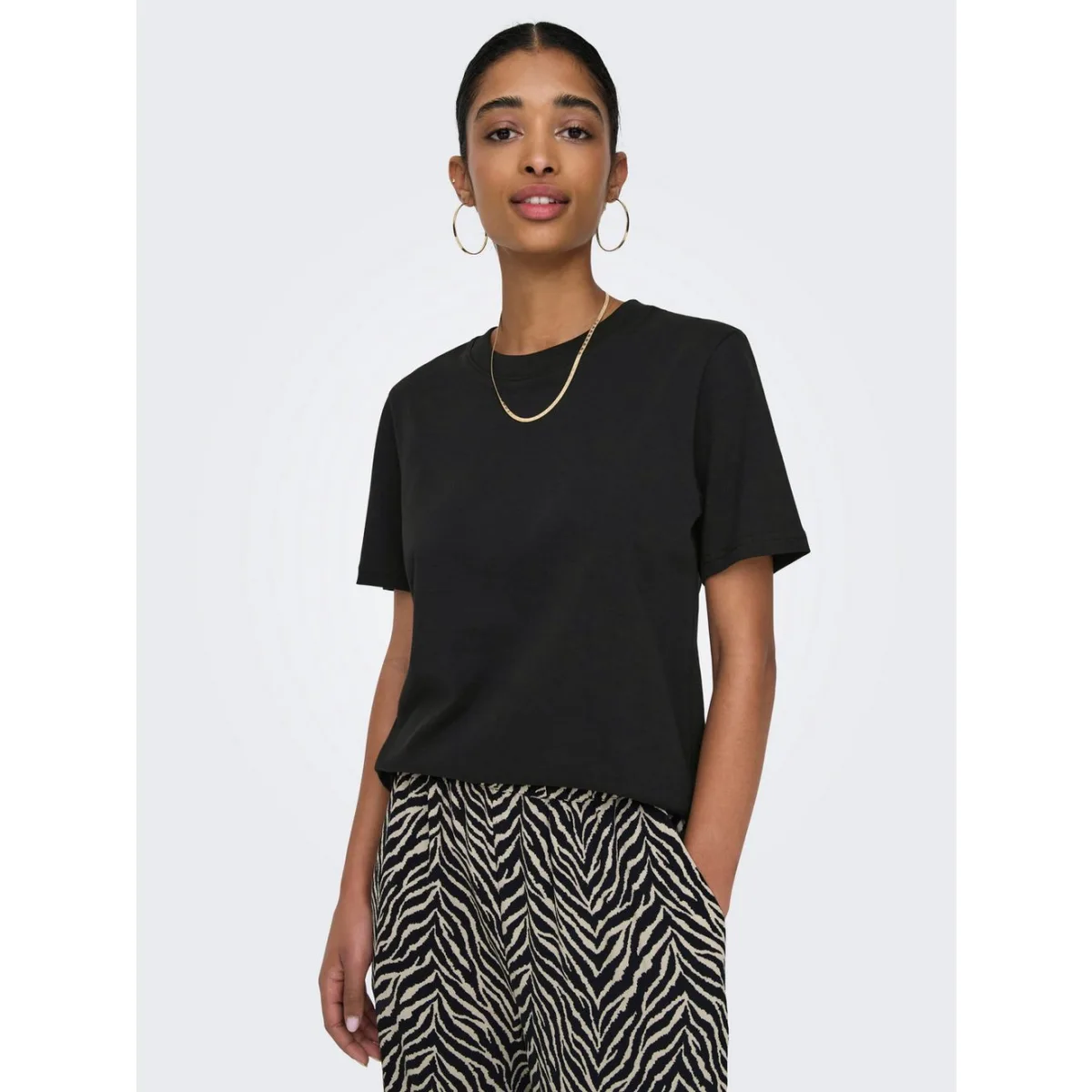 en#10;en#10;Upgrade je garderobe met dit stijlvolle zwarte t-shirt van het populaire merk Only. Dit comfortabele shirt is perfect voor dagelijks gebruik en is gemaakt van 100% katoen, wat zorgt voor een zachte en ademende stof die de hele dag door comfortabel aanvoelt. De korte mouwen en ronde hals maken dit shirt geschikt voor alle seizoenen en gelegenheden. Draag het op een spijkerbroek voor een casual look of combineer het met een rokje voor een meer geklede uitstraling. Dit must-have item mag niet ontbreken in jouw kledingkast en is verkrijgbaar in diverse maten. Bestel deze zwarte Only t-shirt nu in onze webshop en je zult er geen spijt van krijgen!