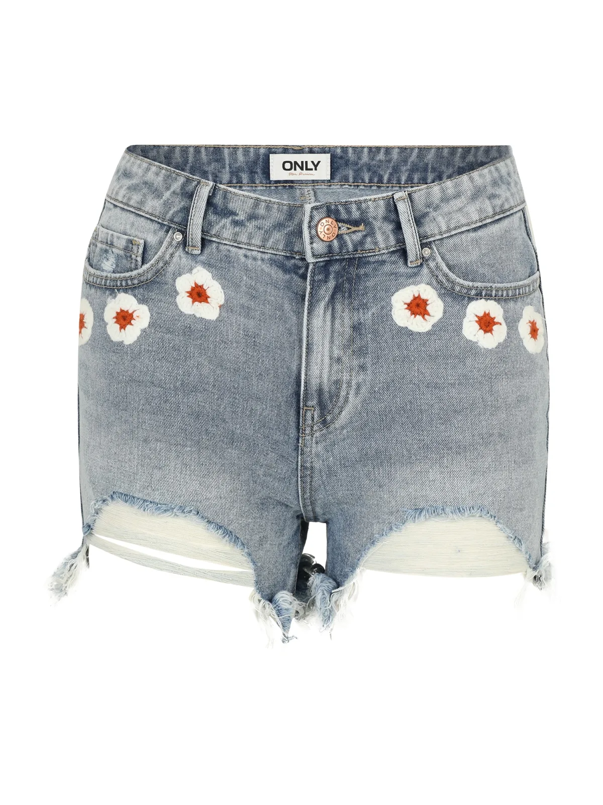 Design: Open randen, Ritssluiting, 5-pocket-style; Type sluiting: Ritssluiting; Materiaal: Denim; Motief: Bloemenprint; Details: Borduursels; Extra's: Studs, Label patch/label flag, Used-look, Vaste grip, Riemlussen; Wassing: ripped; Lengte: Kort/mini; Pasvorm: Regular; Taillehoogte: High waist