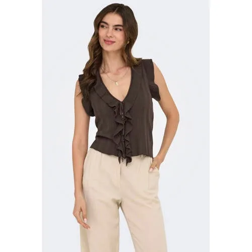 Deze bruine mouwloze dames top van ONLY is een luchtig item voor elke dag. De top heeft een diepe V-hals en een striksluiting aan de voorkant, waardoor je zelf bepaalt hoe open je de hals draagt. De ruches langs de randen zorgen voor een zacht, speels effect dat mooi langs je bovenlichaam valt.Vrouwelijke details voor elke dag Effen bruine kleur die makkelijk te combineren is met jeans, shorts of een rok V-hals met striksluiting voor een verstelbare, open halslijn Mouwloos model, geschikt voor lente en zomer Ruches en strikje geven de top een verfijnde, vrouwelijke uitstraling Gemaakt van 80% viscose / 20% nylon, met een soepele en zachte touch Valt normaal volgens het maatadvies Onderhoudsvriendelijk: wasbaar op 30 graden, lauw strijkbaar en niet in de droogtrommelVoor ontspannen dagen en nette momentenDeze top past goed in je dagelijkse garderobe. Combineer met een denim short en sandalen voor een vrije dag, of draag de top op een nette broek met een blazer voor een verzorgde uitstraling op kantoor of bij een etentje.ONLY: moderne stijl voor elke dagONLY staat voor modieuze items die eenvoudig te combineren zijn en praktisch zijn in het dagelijks leven. De collecties sluiten aan op de laatste trends, met toegankelijke ontwerpen die je garderobe op een eenvoudige manier aanvullen.Een praktische, vrouwelijke top die je het hele seizoen gemakkelijk combineert.