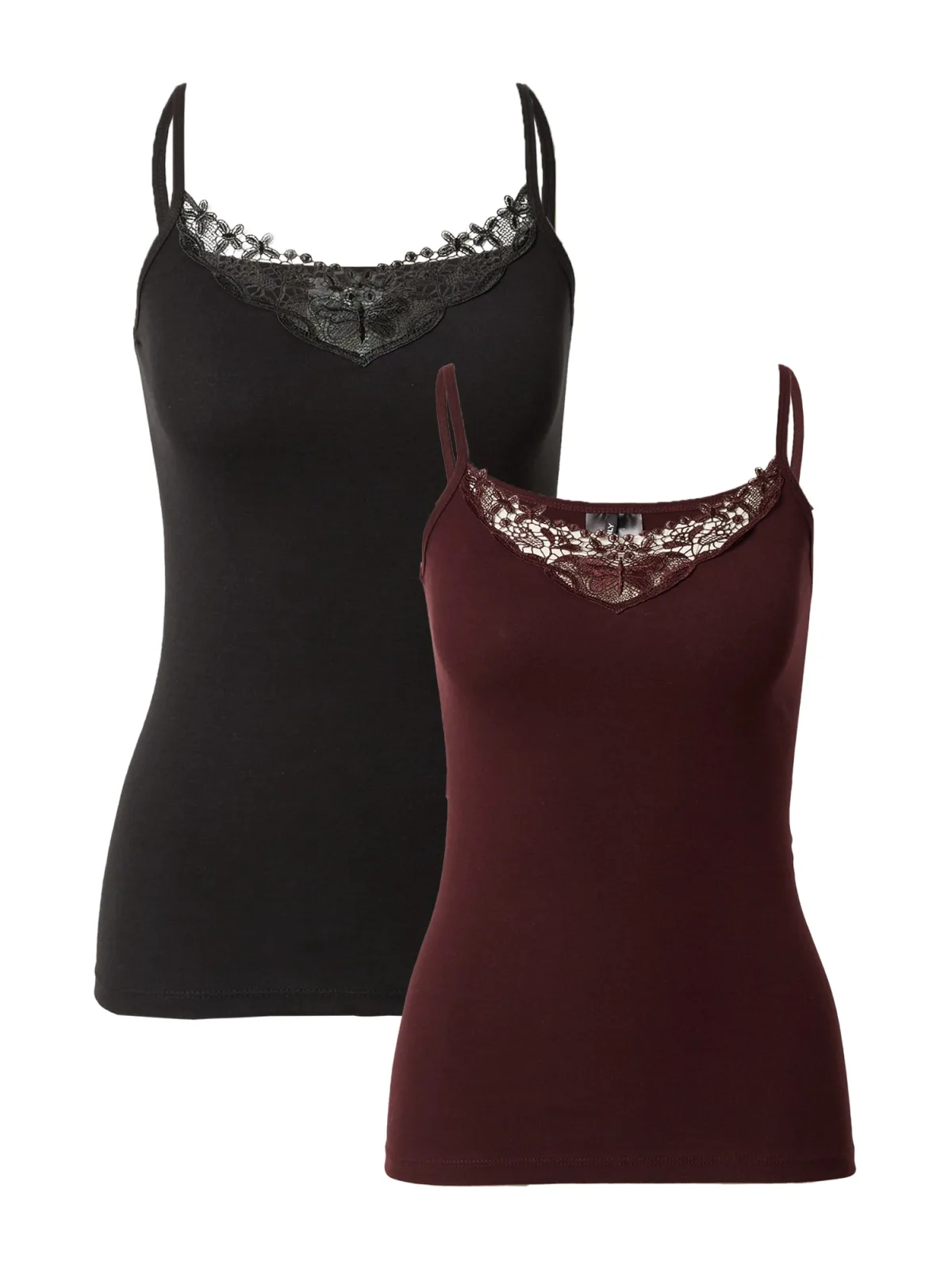 Design: Gevoerde zoom/rand, Rechte zoom; Materiaal: Jersey; Halstype: V-hals; Motief: Effen; Soort bandjes: Spaghettibandjes; Details: Kant; Extra's: Op staal naden, Voelt zacht aan; Pasvorm: Slanke pasvorm; Aantal: 2 Pack; Armlengte: Mouwloos; Lengte: Normale lengte