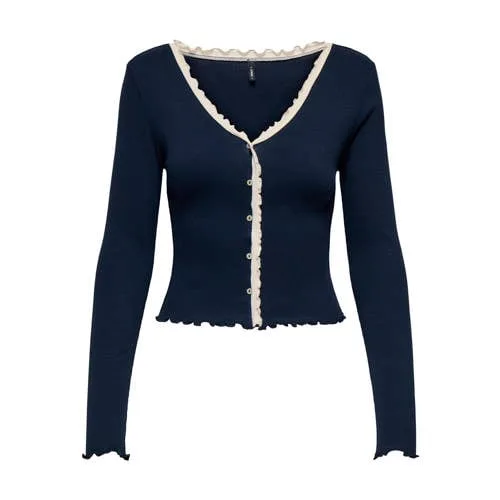 Deze ONLY marineblauwe top is een fijne basic met subtiele details die je dagelijks kunt dragen. De diepe marineblauwe kleur wordt speels onderbroken door ecru accenten, waardoor de top net wat meer karakter krijgt. De V-hals met open nek en de sierlijke ruches langs de halslijn geven een vrouwelijke uitstraling, terwijl de rechte lange mouwen zorgen voor een rustige, tijdloze look. Gemaakt van zacht katoen met een beetje stretch voelt de stof soepel aan en blijft de pasvorm mooi aansluiten.Verfijnde details voor elke dag V-hals met open nek voor een elegante, open uitstraling Contrast bies in ecru die de halslijn subtiel accentueert Ruches langs de hals voor een zachte, vrouwelijke touch Lange, rechte mouwen die comfortabel zitten en makkelijk te stylen zijn Gemaakt van katoen met stretch voor een soepele, aansluitende fit Effen marineblauwe kleur met ecru details, eenvoudig te combinerenGemakkelijk te stylen in jouw dagelijkse looksDeze top past goed bij je dagelijkse garderobe. Draag het model in een high waist jeans voor een casual outfit of combineer met een nette broek voor een werkdag. Ook onder een blazer komt de V-hals met ruches mooi naar voren.ONLY, eigentijdse stijl voor elke dagONLY staat bekend om moderne items die goed passen in een druk dagelijks leven. De collecties zijn afgestemd op trends, maar blijven draagbaar en toegankelijk. Met deze top kies je voor een kledingstuk dat er verzorgd uitziet en comfortabel zit, zodat je er de hele dag prettig in beweegt.Een veelzijdige top die je garderobe op een stijlvolle en praktische manier aanvult.