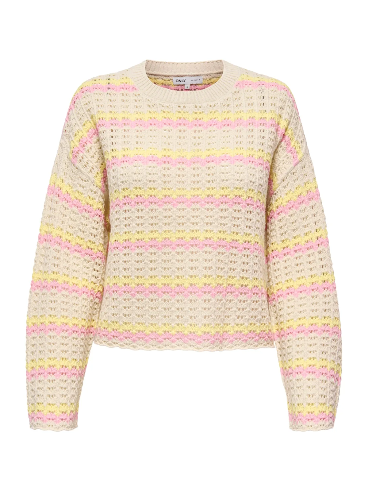 Gebreide damespullover van Only;Model 'Asa';Look: meerkleurig;Pasvorm: Regular fit ;Patroon: gestreept, broderie anglaise;Lengte: Kort;Details: extra brede schouders;Kraagmodel: Hoge ronde hals;Mouwvorm: lange mouwen;Mouwboord: Geschulpte zoom;Rompzoom: Geschulpte zoom;Materiaalverwerking: Ajourpatroon;Materiaal: Katoenmix