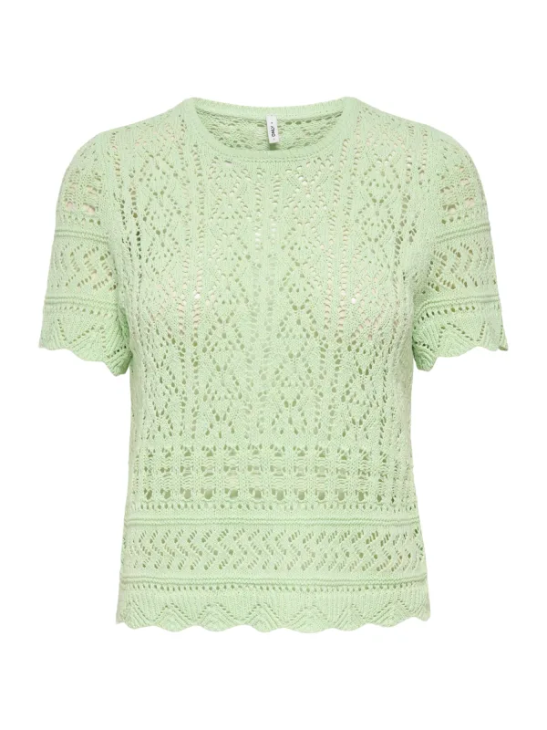 Deze lichtgroene ONLY dames trui is een fijne basic voor elke dag, met net wat extra door de ajourstructuur. De top heeft korte mouwen en een ronde hals, waardoor deze top luchtig genoeg is voor lentedagen en makkelijk te combineren is met je favoriete jeans, rok of pantalon. De zachte gebreide stof met katoen-touch voelt prettig aan op de huid en de rechte mouwen geven een rustige, moderne uitstraling.Licht gebreid met subtiele ajourdetails Lichtgroene top met effen kleur, ideaal voor frisse, zachte looks Korte mouwen en ronde hals, geschikt voor het voorjaar en koele zomerdagen Ajourstructuur in het breisel voor een subtiel speels effect Zachte, comfortabele stof met een fijne katoenkwaliteit Vormvast model dat volgens het maatadvies normaal valt Praktisch in onderhoud: wasbaar op 30 graden en lauw strijkbaar Niet geschikt voor de droogtrommel, zo blijft het breisel mooiPerfect voor jouw dagelijkse outfitsDeze top uit de 'Daily' collectie is gemaakt voor alledaagse momenten. Draag hem boven een high waist jeans voor een casual look of combineer met een nette broek voor een meer geklede stijl. De lichtgroene kleur laat zich makkelijk mixen met neutrale tinten als wit, crème of denim.ONLY, eigentijdse stijl voor elke dagONLY staat bekend om modieuze items die goed aansluiten op het dagelijkse leven. De collecties zijn trendgericht, maar blijven draagbaar en toegankelijk. Met deze trui kies je voor een kledingstuk dat past bij een moderne garderobe en dat je het hele seizoen door blijft pakken.Een lichte, gebreide favoriet die je garderobe eenvoudig aanvult.