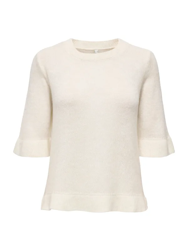 Design: Geribbelde kraag, Geribd ceintuurtje; Materiaal: Knitwear; Halstype: Ronde hals; Motief: Effen; Details: Ruches; Extra's: Fully fashioned, Op staal naden; Pasvorm: Losse pasvorm; Armlengte: Halve mouw; Lengte: Normale lengte