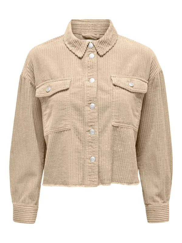 Dames corduroy jack van Only;model 'Marina-Eny Life';look: effen;pasvorm: boxy fit;kraagmodel: platte kraag;Sluiting: enkelrijige knoopsluiting;rompzoom: franjes;Zakken: borstzakken;materiaalverwerking: corduroy;Materiaal: puur katoen