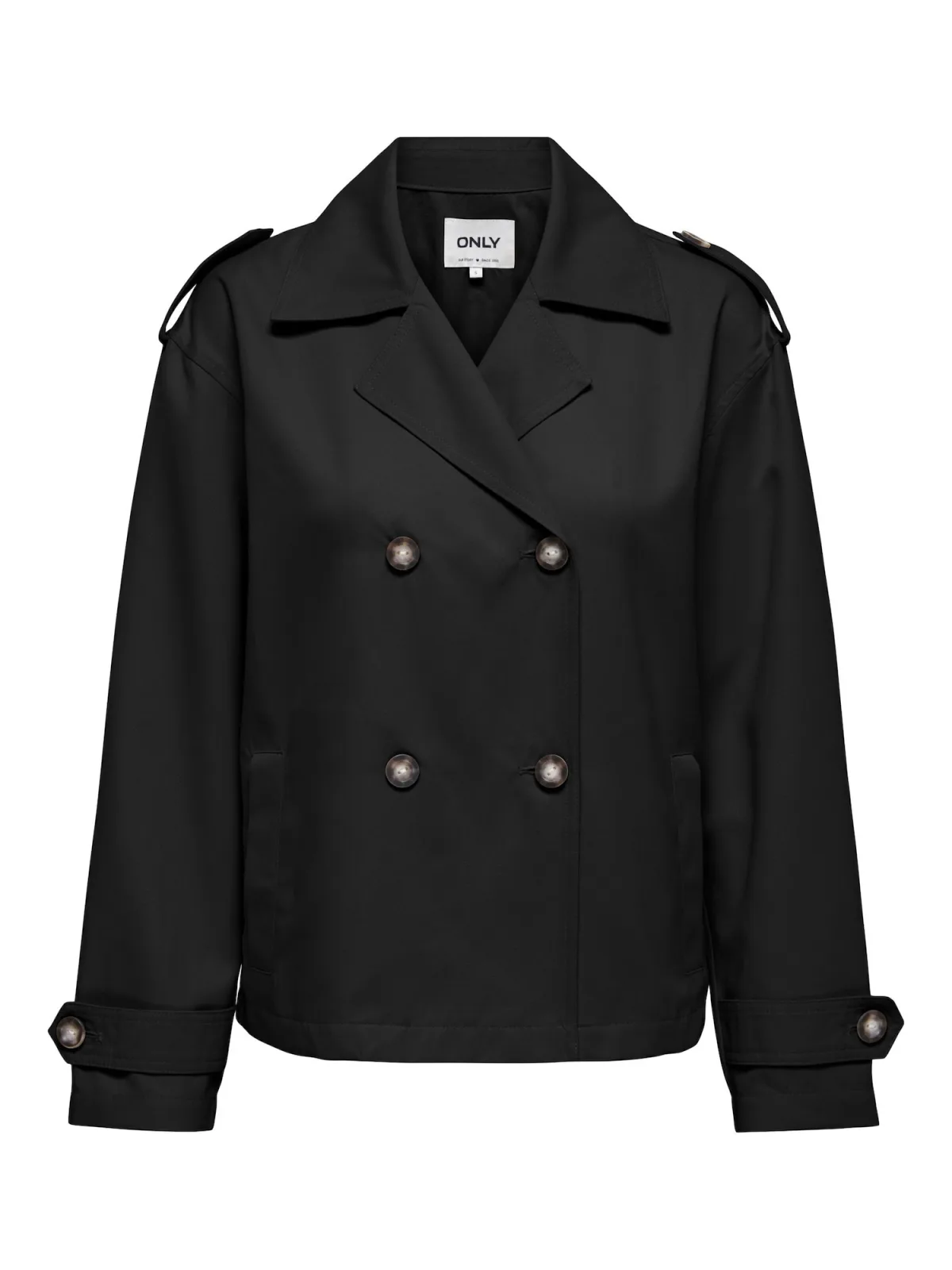 Dames trenchcoat-jas van Only;Model 'Hannah';Look: effen;Pasvorm: Regular Fit;Kraagmodel: Reverskraag;Sluiting: dubbele knoopsluiting;Applicatie: Schoudertrensjes;Details: Achterpas;Mouwvorm: lange mouw;Zakken: zij-steekzakken