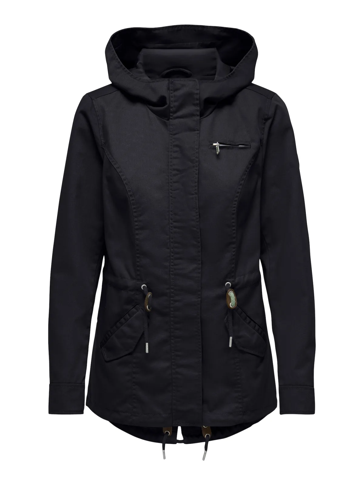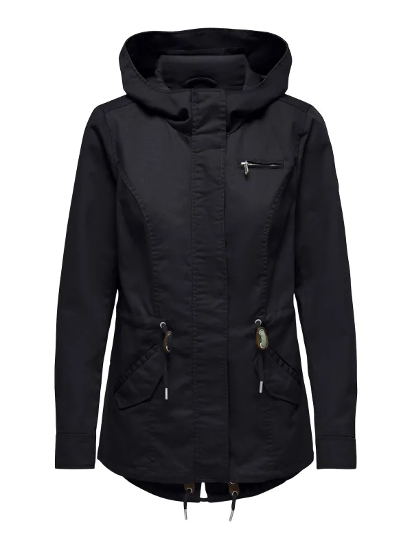 Damesparka van Only;Model 'Lorca';Look: effen;Pasvorm: Regular fit ;Kraagmodel: Capuchon;Sluiting: blinde knoopsluiting, blinde ritssluiting;Applicatie: Labelpatch;Mouwvorm: lange mouwen;Rompzoom: Tunnelkoord;Zakken: Klepzakken, borstzak;Materiaalverwerking: Canvas