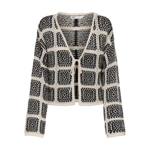 Voor een luchtige laag die je outfit net wat extra geeft, is dit gebreide vest van ONLY een fijne keuze. Het korte model in beige met zwart all over patroon heeft een opengewerkte crochet look die meteen opvalt. De V-hals en rechte lange mouwen geven een rustige basis, terwijl de trekkoorden aan de voorkant zorgen voor een speels detail.Gebreid vest met crochet details Kort damesvest met V-hals, ideaal over een top of jurk Opengewerkte crochet structuur voor een luchtige look Trekkoorden aan de voorkant om het vest subtiel te sluiten Beige met zwart all over patroon dat makkelijk combineert Rechte lange mouwen voor een comfortabele pasvorm Geschikt voor dagelijks gebruik in het voorjaar en op frissere zomerdagen Bevat katoen, wat zorgt voor een soepel en prettig draaggevoel Onderhoudsvriendelijk, wasbaar op 30 graden en lauw strijkbaarZo draag je dit korte crochet vestDit vest past goed over een eenvoudige T-shirt of top met een hoge hals, zodat de V-hals mooi uitkomt. Combineer met een hoge jeans of een rok om het korte model te benadrukken. Voor een relaxte dag stijl je het met sneakers, wil je het wat gekleder dan kan het ook prima met een rechte broek en laarsjes.ONLY voor dagelijkse modeONLY staat bekend om toegankelijke damesmode die meegaat met de trends en geschikt is voor alledag. Met dit vest uit de daily collectie voeg je eenvoudig een nieuw item toe aan je garderobe dat je vaak en op verschillende manieren kunt dragen.Een veelzijdig gebreid vest dat je makkelijk pakt wanneer je outfit wat extra warmte en structuur mag hebben.