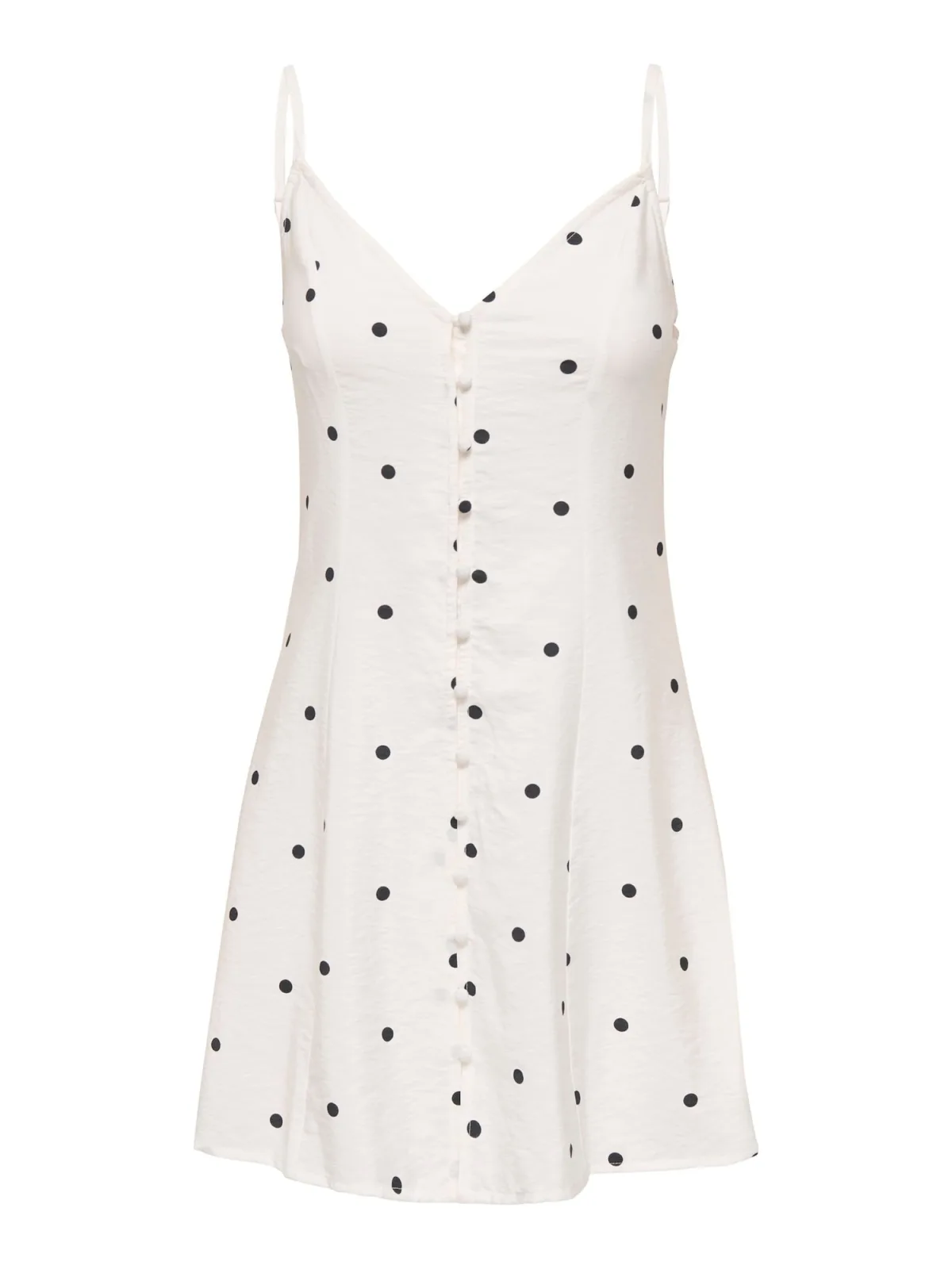 Design: Om te knopen/binden; Type sluiting: Knoopsluiting; Materiaal: Viscose; Halstype: V-hals; Motief: Gestippeld; Soort bandjes: Spaghettibandjes; Extra's: Verstelbare bandjes, All-over patroon; Lengte: Kort/mini; Snit: Getailleerd; Pasvorm: Normale pasvorm; Armlengte: Mouwloos